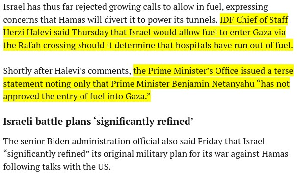 Detailed overview concerning supplies/lack of water, electricity and fuel in Gaza by “Times of Israel”, explaining what is still working and what is not. Obligations to provide fuel (which is a dual-use good) as humanitarian relief under international law are weaker than obligations to provide food, water and medication, and Hamas of course has fuel to keep its military running. However, medium-term advantages for Hamas, which will not run out of fuel quickly anyways, even without diverting humanitarian relief, and the danger of some explosives built from stolen fuel, have to be weighed against the grave immediate humanitarian impact, when hospitals are not operational, when people cannot be freed under rubble without excavators, when desalination and water pumps are only partially in service. All major allies of Israel, including the US, the UK, France and the EU have called for a humanitarian firepause, which would allow international organisations to deliver diesel, medication, food etc. safely and move some sick and injured to safer places where they can be better treated.