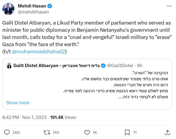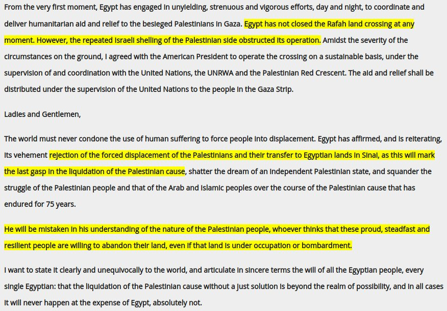 Heute konnten erstmals seit Kriegsbeginn ca. 500 Menschen mit ausländischem Pass sowie 76 Schwerverletzte am Rafah-Grenzübergang Gaza nach Ägypten hin verlassen. Die Vermittlung durch Qatar und USA zwischen Ägypten, Israel und Hamas war erfolgreich. Laut USA hatte die Hamas zuvor die Ausreise von ausländischen Staatsbürgern blockiert. Ägypten machte jedoch Schäden durch israelische Luftangriffe in den ersten Tagen des Krieges noch über Wochen für die geschlossene Grenze und auch in die umgekehrte Richtung für die nach der unter Druck der USA zwischen Ägypten und Israel erfolgten Vereinbarung noch über Tage verzögerte Lieferung von Hilfsgütern nach Gaza (womit die „vollständige Belagerung“ ein Ende fand) verantwortlich. Ohne von Israel zugesicherte humanitäre Korridore und Feuerpausen dürfte der Abtransport von Kranken und Verletzten aus dem Norden Gazas, wo sich ein Großteil der Krankenhäuser befindet und es die meisten Verletzten gibt, zudem sehr schwer bis unmöglich sein. Al-Sisi lehnt eine Ausreisemöglichkeit für eine größere Zahl an Palästinensern ab. Für ihn ist die Verhinderung der Flucht aus Gaza – offenbar auch gegen den Willen der Einzelnen – eine Frage von „Stolz, Standhaftigkeit und Widerstandsfähigkeit“ des palästinensischen Volkes. Politiker aus Netanyahus Likud-Partei brachten indes nun Vorschläge, die Palästinenser aus Gaza nach Ägypten umzusiedeln – ein schwerer Bruch humanitären Völkerrechts nach Artikel 147 der 4. Genfer Konvention und damit ein Kriegsverbrechen. Distel-Atbaryan forderte gar, dass eine grausam rächende IDF Palästinenser vor die Wahl von Flucht oder Tod stellen sollte. Distel-Atbaryan war kürzlich zum Rücktritt gedrängt und ihr Ministerium aufgelöst worden, nachdem dieses selbst nach dem Angriff durch die Hamas kaum Öffentlichkeitsarbeit geleistet und sich somit als nutzlos erwiesen hatte. Zuvor war sie besonders durch hasserfüllte Äußerungen gegenüber Gegner_innen der Justizreform aufgefallen.