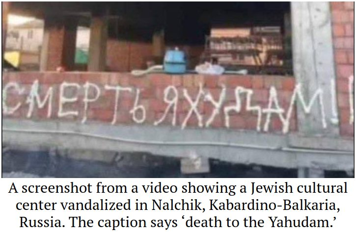 “Meanwhile, a Jewish cultural center was set on fire in Nalchik, the capital city of Kabardino-Balkaria, according to images posted on Telegram.