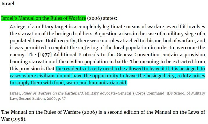 There have been a lot of discussions concerning the legal status of these measures. I think these legal considerations are really important to understand the historical significance of the current events and their political implications, the legal notions serve as a guideline to gain a nuanced understanding of the conflicts involved and international humanitarian law also provides an important framework for the international diplomacy inevitably involved in the conflict (which will hopefully not spillover and escalate at further fronts beyond Gaza). Yet, since this legal sophistry might seem cynical, I want to quickly give my moral and political view: The measure of cutting water, which has been announced and now partially revoked, to enforce the release of hostage is utterly immoral, irrational and also a politically devastating deception of the Israeli public. Structurally this kind of measure is a case of indiscriminate, possibly lethal measure of coercion against the civilian population of the enemy to coerce him to end a (real or perceived) injustice, in these respects ressembling the taking of hostages by Hamas, despite all the other differences between the fundamental political goals of Israel and Hamas. These methods of coercion, treating civiian lifes as mere means, undermine any kind of ethical relationships. The weaponisation of humanitarian aid threatens to question all set boundaries of warfare. Early in the war the announcement of the “complete siege” set the tone for what is to follow, brutalising the discourse and framing the war as an endeavour against the general population of Gaza. Furthermore the measure cannot work, since unlike the general population of Gaza Hamas fighters will always have access to their stockpiles of food and to wells. Yes, at some points in history starvation of the general population worked as a mean of coercion, for example in the Biafra war (where starvation killed round about a million people of Biafra). Back then the progressive, separatist forces of Biafra finally capitulated. But is this to be expected from the Hamas and PIJ Jihadists? They would certainly rather start killing hostages if they would really get into trouble getting food. Thus, the message to the Israeli and world public was: We are doing something for the hostages, we stand together firmly and decidedly, applying the harshest measures of force to free the hostages, while in fact a public discussion of the hardly resolvable conflict between different objectives, freeing the hostages, protecting Israeli soldiers and weakening/defeating Hamas is avoided (while some members of government like Smotrich declared early on that the fate of the hostages should not be a priority). As an infringement of Israeli and international humanitarian law the measure already did great damage for the cooperation with international allies, it increases the risk of further escalations elsewhere than in Gaza and ultimately it weakens the rule of law in Israel and does damage to any potential future peace process. Those seeking to demonise Israel for its pursuit of legitimate military goals against tyrannical Jihadi forces in an act of self-defense against their massacres among the Israeli civilian population, should be reminded however that the “complete siege” has been partially lifted after US calls for adherence humanitarian international law and also controversy within Israeli society, and that its immediate effects have luckily been limited particularly thanks to Gaza’s own ground water supplies and UN stockpiles. But now let us look at the legal details. While not being a legal expert, I try to stay in line with general textbook opinions concerning the rules for sieges and expert opinions on the announced siege of Gaza, supplemented by some explanations and observations which might help to clear some missunderstandings which I have encountered in conversations.